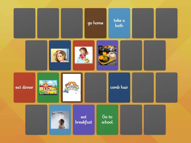 Go to school, eat breakfast, eat dinner, take a bath, go home, comb hair, do homework, brush teeth, Wake up, go to sleep, Get up, Take the bus, Get dressed,