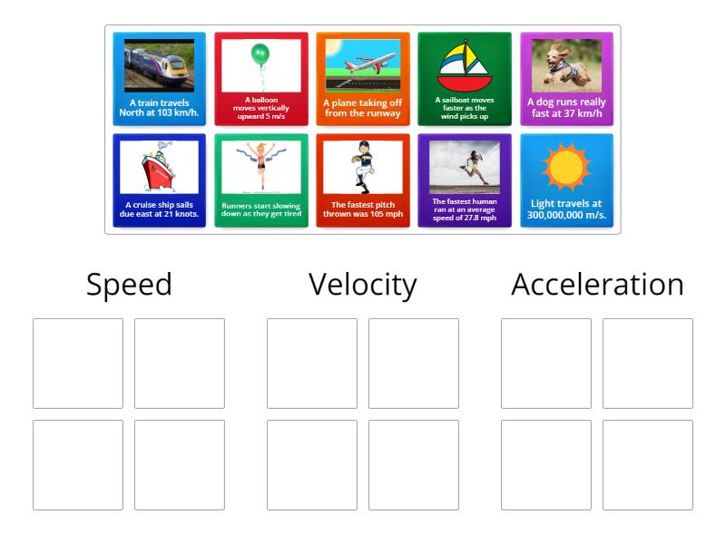Speed: A dog runs really fast at 37 km/h, Light travels at 300,000,000 m/s., The fastest human ran at an average speed of 27.8 mph, The fastest pitch thrown was 105 mph, Velocity : A train travels North at 103 km/h., A balloon moves vertically upward 5 m/s, A cruise ship sails due east at 21 knots., Acceleration : Runners start slowing down as they get tired, A sailboat moves faster as the wind picks up, A plane taking off from the runway,
