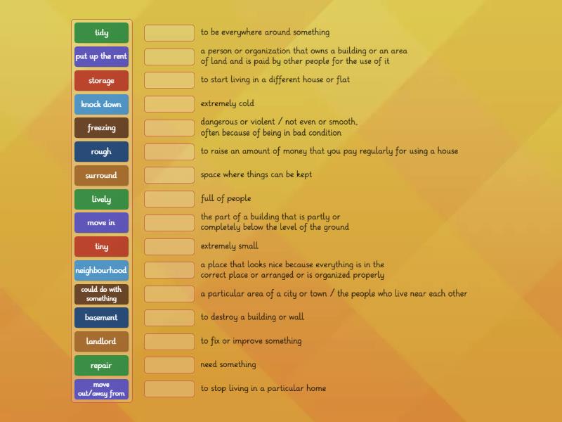 freezing - extremely cold, could do with something - need something, tiny - extremely small, rough - dangerous or violent / not even or smooth, often because of being in bad condition, surround - to be everywhere around something, move out/away from - to stop living in a particular home, landlord - a person or organization that owns a building or an area of land and is paid by other people for the use of it, put up the rent - to raise an amount of money that you pay regularly for using a house, lively - full of people, neighbourhood - a particular area of a city or town / the people who live near each other, storage - space where things can be kept, knock down - to destroy a building or wall, repair - to fix or improve something, basement - the part of a building that is partly or completely below the level of the ground, tidy - a place that looks nice because everything is in the correct place or arranged or is organized properly, move in - to start living in a different house or flat,