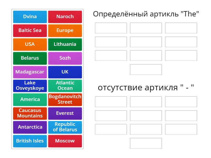 Определённый артикль "The": Naroch, UK, British Isles, Atlantic Ocean, Republic of Belarus, USA, Dvina, Sozh, Caucasus Mountains, Baltic Sea, отсутствие артикля " - ": Madagascar, America, Belarus, Everest, Lake Osveyskoye, Bogdanovitch Street, Europe, Antarctica, Moscow, Lithuania,