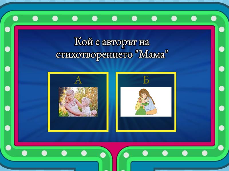 1) Кой е авторът на стихотворението "Мама" a) b) 2) Каква е роклята на Елина ? a) бяла b) жълта c) червена 3) Тази нота е: a) b) 4) Колко триъгълника откривате: a) 5 b) 6 c) 7 5) Коя е най-голямата планета в Слънчевата система? a) Земята b) Слънцето c) Меркурий d) Юпитер 6) Кой музикален инструмент е духов? a) пиано b) китара c) гайда d) тъпан 7) Глаголът отговаря ли на въпроса "Какво е това?" a) b) 8) Намислих си число, към него добавих 10, разделих го на 3 и получих 6. Кое число съм си намислил? a) b) 9) Подреди буквите в дума: Л Н И А И М a) b) 10) Глаголите нямат: a) род b) число c) и двете 11) Кой континент е посочен на картата? a) Северна Америка b) Европа c) Африка 12) Кой е най-високият планински връх на Земята? a) Боровец b) Еверест c) Черни връх 13) Кой цвят ще получим при смесването на жълт и син цвят? a) b) 14) Кой празник честваме на 24 май? a) Освобождението на България b) Ден на българската азбука и култура c) нито едно от изброените 15) Кой обичай свързвате с Никулден? a) приготвяне на риба b) боядисване на яйца c) коледари 16) Намери броя на гъските: a) b) 17) Защо нещата падат, когато ги пуснете? a) b) 18) Коя е планината, която разделя България на две половини? a) Пирин b) Рила c) Стара планина d) Родопи 19) Напишете името на композитор, който сте изучавали: a) b) 20) Кое хоро се брои неравномерно на две? a) Пайдушко хоро b) право хоро c) ръченица 21) Думата "съм" е ? a) прилагателно име b) съществително име c) глагол 22) Коя дума е написана правилно? a) разте b) пътеката c) симвул 23) Как се нарича уредът, с който наблюдаваме отдалечени обекти? a) b) 24) Разбий шифъра a) b)