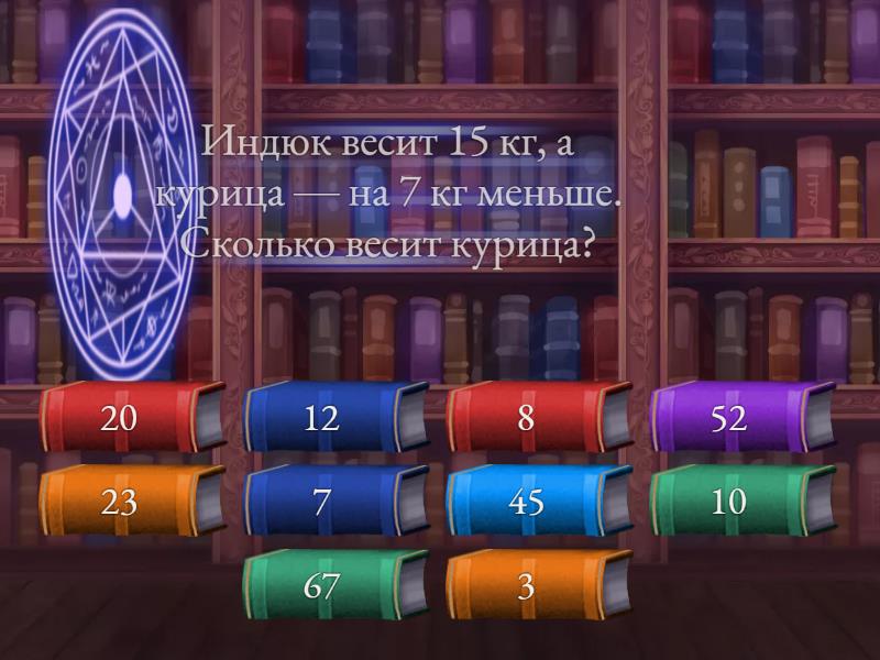 8 - Индюк весит 15 кг, а курица — на 7 кг меньше. Сколько весит курица?, 67 - У Коли в одной коллекции 49 марок, а в другой— на 18 больше. Сколько марок во второй коллекции у Коли?, 23 - Саша, помогая маме, вымыл15 тарелок и 8 вилок. Сколько всего предметов вымыл Саша?, 12 - 32-20, 45 - 55-10, 52 - 82-30, 20 - 66-46, 10 - 25-15, 3 - 33-30, 7 - 67-60,