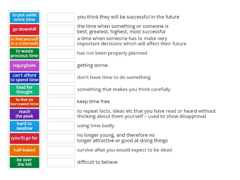 be over the hill - no longer young, and therefore no longer attractive or good at doing things, (you'll) go far - you think they will be successful in the future, reach the peak - the time when something or someone is best, greatest, highest, most successful, go downhill - getting worse, to find yourself at a crossroads - a time when someone has to make very important decisions which will affect their future, hard to swallow - difficult to believe, regurgitate - to repeat facts, ideas etc that you have read or heard without thinking about them yourself – used to show disapproval, food for thought - something that makes you think carefully, half-baked - has not been properly planned, to put aside some time - keep time free, to waste precious time - using time badly, can't afford to spend time - don't have time to do something, to live on borrowed time - survive after you would expect to be dead,