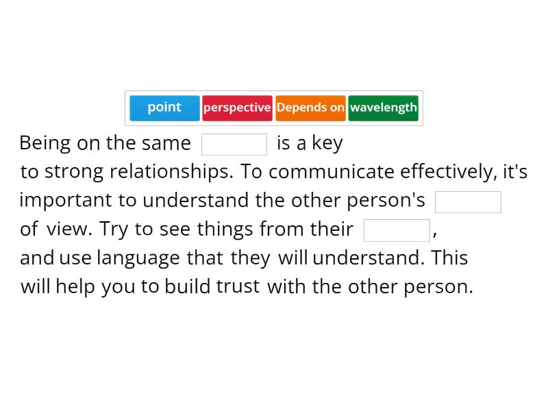 Being on the same ____ is a key to strong relationships. To communicate effectively, it's important to understand the other person's ____ of view. Try to see things from their ____, and use language that they will understand. This will help you to build trust with the other person. Getting ____ to the point is important. When communicating, it's important to be clear and concise. Avoid using long, complex sentences or jargon that may ____ the other person. Instead, get straight to the ____ and use simple language that everyone can understand.