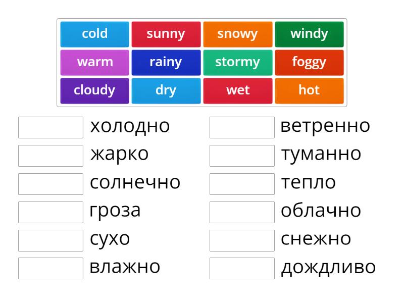 sunny - солнечно , warm - тепло, windy - ветренно , hot - жарко, cloudy - облачно, foggy - туманно, rainy - дождливо , snowy - снежно , stormy - гроза, wet - влажно , cold - холодно , dry - сухо ,