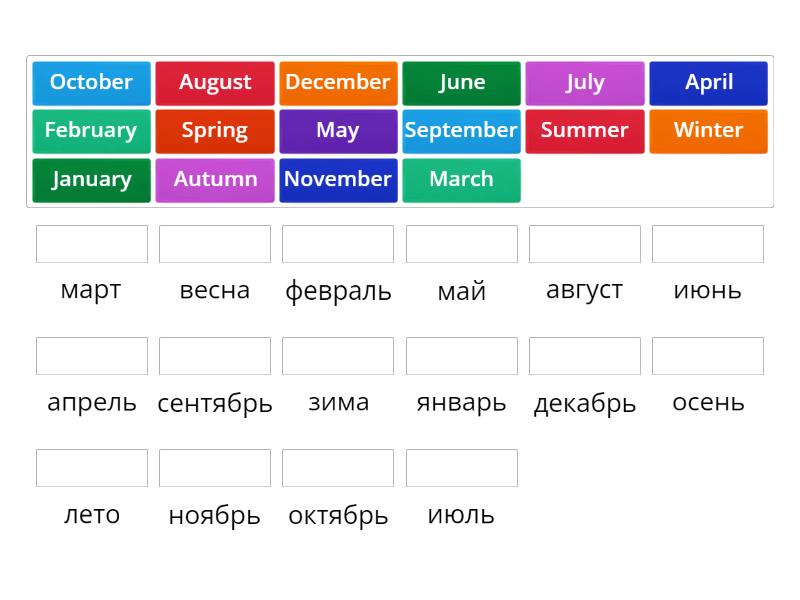 Winter - зима, Summer - лето, Spring - весна, Autumn - осень, September - сентябрь, October - октябрь , November - ноябрь, December - декабрь, January - январь, February - февраль, March - март, April - апрель, May - май, June - июнь, July - июль, August - август ,
