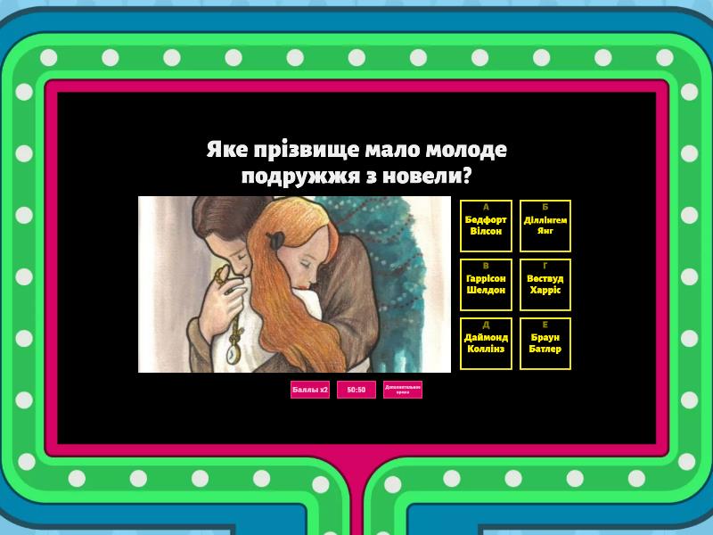 1) Яке прізвище мало молоде подружжя з новели? a) Бедфорт Вілсон b) Діллінгем Янг c) Гаррісон Шелдон d) Вествуд Харріс e) Даймонд Коллінз f) Браун Батлер 2) Скільки коштів вдалося зекономити Деллі перед Різдвом? a) 2 долари 10 центів b) 1 долар 50 центів c) 3 долари 20 центів d) 1 долар 87 центів e) 5 доларів f) 1 долар 68 центів 3) На думку Делли, її чоловік заслуговував на подарунок ... a) особливий, рідкісний, коштовний b) дорогий, безцінний, винятковий c) вишуканий, стильний d) модний, трендовий e) сучасний, золотий, витончений f) елегантний, добірний 4) Якими речами пишалося молоде подружжя? a) автомобілем та будинком b) власною фермою c) стильним одягом d) волоссям та годинником e) обручкою та ланцюжком f) картинами та колекцією монет 5) Волоссю дівчини могла б заздрити сама a) Хюррем-султан b) цариця Ніфертіті c) цариця Клеопатра d) королева Єлизавета I e) королева Маргарита Анжуйська f) цариця Савська 6) Який подарунок обрала Делла для свого чоловіка? a) срібний ланцюжок для хрестика b) платиновий ланцюжок для кишенькового годинника c) срібний перстень d) годинник у золотій оправі e) шкіряний ремінь f) стильні черевики 7) Який подарунок отримала Делла від свого чоловіка? a) золоту обручку b) срібні сережки c) гарну сукню d) ланцюжок з підвіскою e) набір черепахових гребінців f) срібну діадему 8) Чому О.Генрі називає героїв новели волхвами? a) пожертвували заради одного своїми захопленнями b) подарували один одному вже непотрібні подарунки c) пожертвували одне для одного найдорожчими своїми скарбами d) вони були дуже мудрі, як волхви e) їхні дари були мудрими f) вміли приймати подарунки