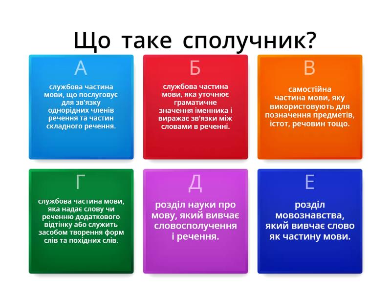 1) Що таке сполучник? a) службова частина мови, що послуговує для зв'язку однорідних членів речення та частин складного речення. b) службова частина мови, яка уточнює граматичне значення іменника і виражає зв'язки між словами в реченні. c) самостійна частина мови, яку використовують для позначення предметів, істот, речовин тощо. d) службова частина мови, яка надає слову чи реченню додаткового відтінку або служить засобом творення форм слів та похідних слів. e) розділ науки про мову, який вивчає словосполучення і речення. f) розділ мовознавства, який вивчає слово як частину мови. 2) Однорідні члени речення це a) розділ мовознавства, який вивчає слово як частину мови. b) члени речення, які відповідають на одне й те ж питання, поставлене від одного й того ж слова в реченні c) другорядний член речення, що означає предмет, на який спрямована дія або щодо якого ця дія відбувається. d) другорядний член речення, що вказує на ознаку предмета. e) самостійна частина мови, що виражає ознаку предмета f) самостійна частина мови, що позначає кількість предметів або їхній порядок при лічбі 3) Стилі мовлення це a) повідомлення про певні події, що відбуваються в часі b) Тексти різних типів c) слова, що характеризуються спільними лексичними ознаками, властивими їм граматичними категоріями, синтаксичними функціями і засобами словотвору. d) це самостійна частина мови, що вказує на особу, предмет, ознаку, кількість, але не називає їх. e) службова незмінна частина мови, яка надає окремим словам чи реченням додаткових смислових відтінків і служить для утворення нових слів f) сукупність мовних засобів для вираження думок, об'єднаних змістом і цілеспрямованістю висловлювання 4) Які ви знаєте стилі мовлення? a) опис, розповідь, роздум b) роздум, худужній, публіцистичний, офіційно-діловий, науковий, розмовний c) роздум, публіцистичний, розмовний d) розмовний, публіцистичний, науковий, художній, офіційно-діловий, церковний e) розповідь, науковий, розмовний f) науковий, публіцистичний , конфесійний, роздум 5) Де використовують художній стиль? a) у колі близьких людей, за неофіційних обставин b) у науці, техніці, освіті c) у художній літературі d) у відносинах між державами (дипломатії), юриспруденції (судочинстві),службових стосунках, ділових паперах e) у суспільному житті f) у розмові двох осіб 6) Де використовують розмовний стиль? a) у колі близьких людей, за неофіційних обставин b) у науці, техніці, освіті c) у художній літературі d) у відносинах між державами (дипломатії), юриспруденції (судочинстві),службових стосунках, ділових паперах e) у суспільному житті f) у розмові двох осіб 7) Де використовують публіцистичний стиль? a) у колі близьких людей, за неофіційних обставин b) у науці, техніці, освіті c) у художній літературі d) у відносинах між державами (дипломатії), юриспруденції (судочинстві),службових стосунках, ділових паперах e) у суспільному житті f) у розмові двох осіб 8) Де використовують офіційно-діловий стиль? a) у колі близьких людей, за неофіційних обставин b) у науці, техніці, освіті c) у художній літературі d) у відносинах між державами (дипломатії), юриспруденції (судочинстві),службових стосунках, ділових паперах e) у суспільному житті f) у розмові двох осіб 9) ЗВЕРТАННЯМ називають a) висловлення якоїсь особи, передане дослівно, без змін. b) слово або сполучення слів, що називає того, до кого звертають