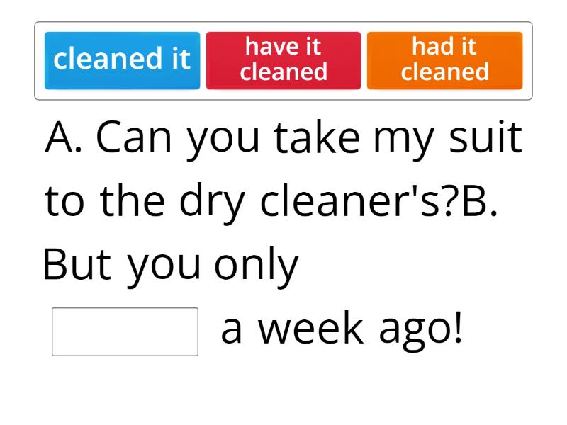 A. Can you take my suit to the dry cleaner's?B. But you only ____ a week ago! I'm going to ____ at the hairdresser's. ____ at the moment, my husband is very practical and handy! A. I can't read this menu, the writing is too small. B. You should ____. A. Did you ____B. Yes, they're bringing it later. They're ____ They're painters and decorators. A. These are great photos! I'll take them to the print shop to____