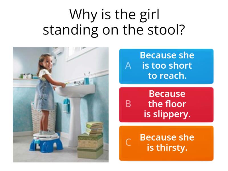 1) Why is the girl standing on the stool? a) Because she is too short to reach. b) Because the floor is slippery. c) Because she is thirsty. 2) Where are the kids going? a) To the grocery store. b) To a party. c) To school. 3) Why do the kids have balls? a) Because it is time for school. b) Because they are playing. c) Because they are inside. 4) Today I had an appointment. Someone listened to my heartbeat and how I breathed. I had to get a shot. Where was I? a) b) c) 5) Today I went on a field trip! I saw lots of fun animals and got to ride on a tractor. I even got to feed a horse. Where did I go? a) b) c)