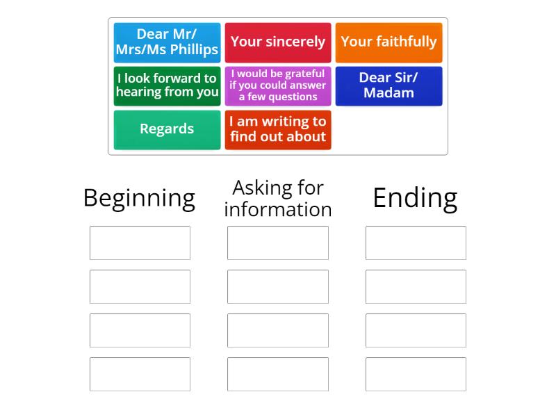 Beginning: Dear Sir/ Madam, Dear Mr/ Mrs/Ms Phillips, Asking for information: I am writing to find out about, I would be grateful if you could answer a few questions, Ending: I look forward to hearing from you, Regards, Your faithfully, Your sincerely ,