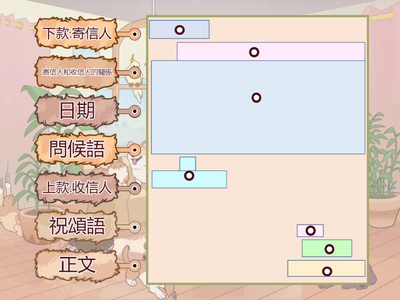 上款:收信人, 下款:寄信人, 寄信人和收信人的關係, 正文, 祝頌語, 日期, 問候語.