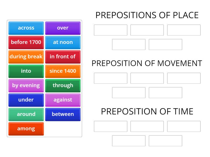 PREPOSITIONS OF PLACE: against, among, under, between, in front of, PREPOSITION OF MOVEMENT: into, over, through, across, around, PREPOSITION OF TIME: by evening , before 1700, since 1400, during break, at noon,