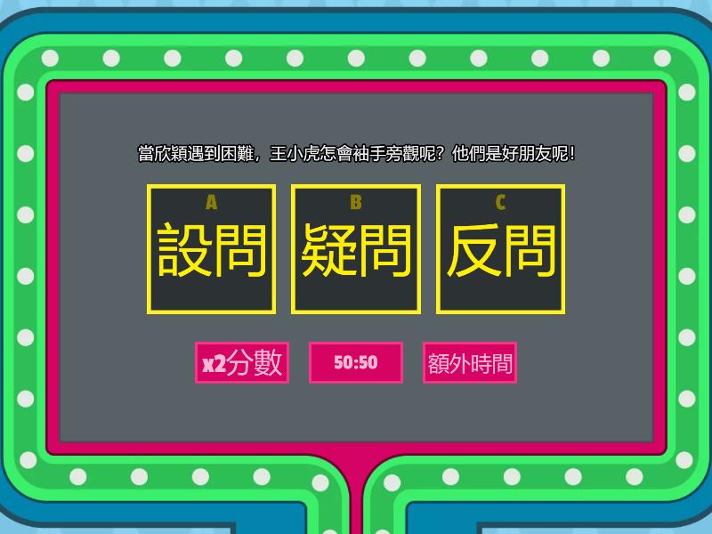 1) 王小虎,今天的早餐吃甚麼呢?原來吃煎雙蛋加多士。 a) 反問 b) 設問 c) 疑問 2) 陳媽媽對你照顧得無微不至,難道你感受不到嗎? a) 反問 b) 設問 c) 疑問 3) 王阿花,你為什麼經常去廁所呢? a) 反問 b) 設問 c) 疑問 4) 閲讀書籍有甚麼好處呢?我認為可以增廣見聞。 a) 反問 b) 設問 c) 疑問 5) 你怎能把重要的工作交給粗心大意的王小虎呢? a) 反問 b) 設問 c) 疑問 6) 你最喜歡的運動是甚麼?我最喜歡的運動是打羽毛球。 a) 反問 b) 設問 c) 疑問 7) 你怎麼會不認識彭校長? a) 反問 b) 設問 c) 疑問 8) 這個蛋糕是誰做的?是你嗎? a) 反問 b) 設問 c) 疑問 9) 這次是千載難逢的機會,李老師怎會錯過? a) 反問 b) 設問 c) 疑問 10) 你對這項安排有甚麼意見? a) 反問 b) 設問 c) 疑問 11) 當欣穎遇到困難,王小虎怎會袖手旁觀呢?他們是好朋友呢! a) 反問 b) 設問 c) 疑問 12) 李老師問:「你們聽過『望梅止渴』這個成語故事嗎?」 a) 反問 b) 設問 c) 疑問 13) 你的晚禮服十分漂亮,不知道是誰設計的? a) 反問 b) 設問 c) 疑問 14) 八時了,弟弟還不起床? a) 反問 b) 設問 c) 疑問 15) 今天有體育課,阿花怎麼不記得了? a) 反問 b) 設問 c) 疑問