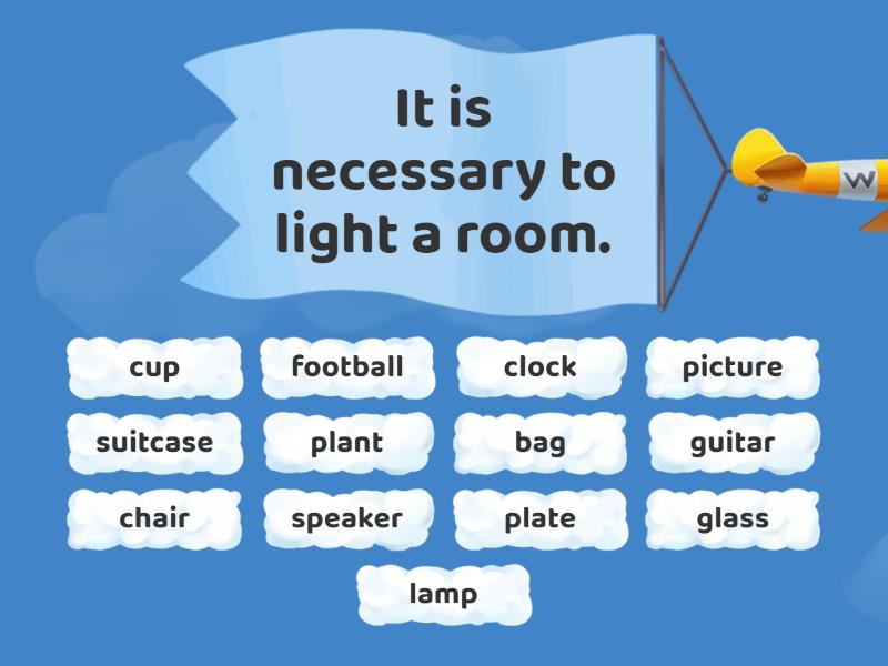 lamp - It is necessary to light a room., guitar - I am a musician and I use a..., bag - I will go shopping. I need a..., plate - I have a big ... because I eat a lot, clock - Loot at the ...! It's very late!, glass - I need a ... of lemonade, please., football - Messi uses this to play., speaker - I always listen rock and roll with my..., picture - I don't like that... It looks ugly., suitcase - I use it when I want to travel., plant - I have one big... in my garden., chair - I am tired. Where is my...?, cup - It's cold. I need a... of tea.,