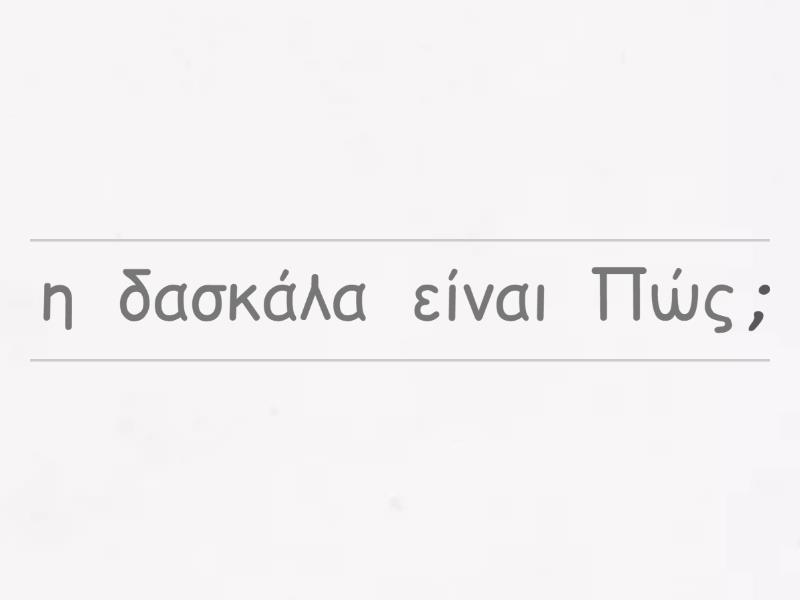 Μου αρέσει η πίτα., Δε μου αρέσει το λεμόνι., Μου αρέσει το μέλι., Δε μου αρέσει το τυρί., Πώς είναι η δασκάλα;, Η δασκάλα είναι ψηλή., Πώς είναι ο κύριος Πέτρος;, Ο κύριος Πέτρος είναι καλός., Βλέπω μια πράσινη καρέκλα., Βλέπω δυο κόκκινα τετράδια., Θέλω τέσσερα τετράδια, παρακαλώ., Θέλω δύο πιάτα και δύο ποτήρια, παρακαλώ., Εγώ γράφω μια άσκηση., Εγώ τρώω μια πίτα με τυρί., Εγώ πίνω ένα ποτήρι γάλα.,