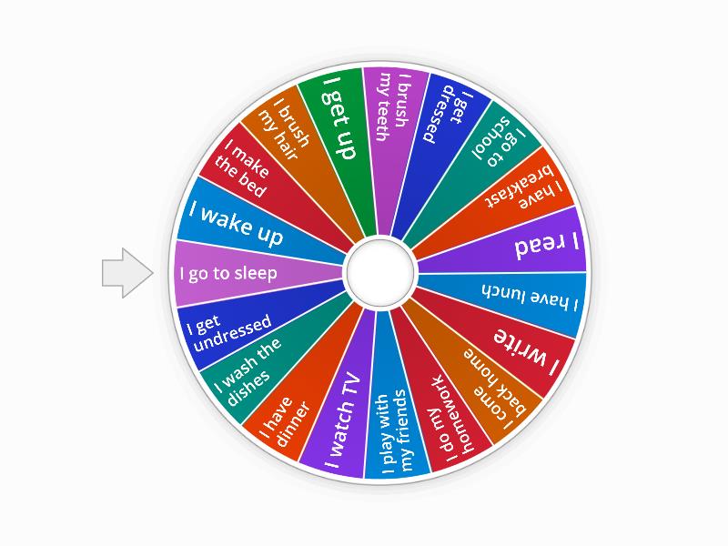 1) I wake up 2) I make the bed 3) I brush my hair 4) I get up 5) I brush my teeth 6) I get dressed 7) I go to school 8) I have breakfast 9) I read 10) I have lunch 11) I write 12) I come back home 13) I do my homework 14) I play with my friends 15) I watch TV 16) I have dinner 17) I wash the dishes 18) I get undressed 19) I go to sleep
