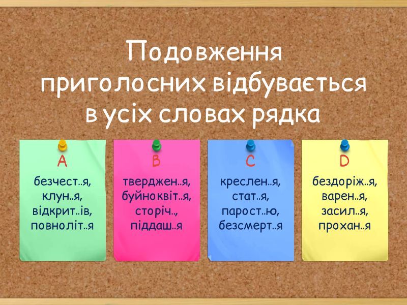 1) Літеру и слід писати в усіх словах рядка a) аркт..чний, черв..нь, віт..рець, зл..денний b) кр..ло, хв..лювати, л..сиця, св..тина c) мереж..во, тепл..ця, вул..чка, в..личезний d) фіз..ка, п..ріг, кр..вий, мар..во e) ж..ття, в..сочінь, бр..ніти, с..лище 2) Літеру е слід писати в усіх словах рядка a) вип..щений, долон..чка, м..тричний, зуп..нятися b) удалеч..ні, ліж..чко, м..ткий, кр..латий c) книж..чка, м..даль, ш..почеться, шел..ст d) од..колон, б..нтежити, дал..на, кл..котіти e) піс..нька, б..рег, кач..чка, боч..чка, зуп..нка 3) Усі слова вживаються без апострофа у рядку a) дзв..якнути, мавп..ячий, цв..ях, медв..яний, моркв..яний b) рум..яний, мереф..янський, верб..я, В..ячеслав, Лук..яненко c) роз..ятрити, з..ясувати, міль..ярд, гар..ячий, фортеп..яно d) трьох..ярусний, дит..ясла, р..юмсати, Св..ятослав, пред..явник e) Мін..юст, св..ято, р..ясно, б..юст, бур..ян 4) Усі слова вживаються з апострофом у рядку a) моркв..яний, любов..ю, ком..юніке, різьб..ярство b) Лук..янівка, розв..язати, Стеф..юк, з..юрмитися c) пор..ядок, св..яткувати, торф..яник, духм..яний d) грав..юра, надвечір..я, В..язьма, пред..явник e) трав..яний, черв..як, св..ященник, прем..єра 5) М'який знак слід писати в усіх словах рядка, ОКРІМ a) міл..ярд, брин..чати, модел..єр b) учител..чин, калинон..ці, Бат..ківщина c) Ман..чжурія, (у) жмен..ці, промін..чик d) Тан..чин, жен..шень, піднос..ся e) пал..чик, дон..чин, нян..чити 6) НЕ потрібна жодна буква на місці пропуску в усіх словах рядка a) безвиїз..но, облас..ний, пес..ливий b) балас..ний, шіс..надцятий, перс..ні c) ад’ютан..ський, свис..нути, улес..ливий d) захис..ний, кіс..лявий, турис..ський e) наміс..ник, тиж..ня, ціліс..ний 7) Подвоєні букви треба писати в усіх словах рядка a) від..звеніти, щоден..ик, завдан..ь b) попідтин..ю, склян..ий, об..ризкати c) гостин..ість, бов..аніти, л..яний d) числен..ий, шален..ий, незмін..ий 8) Зі знаком м'якшення всі слова пишуться в рядку a) нян..чити, брен..кати, вел..можа, т..мяний b) віс..тю, нен..чин, змен..шити , (у) бан..ці c) приятел..ці, таріл..ці, різ..бяр, учител.ство d) Натал..ці, людс..кість, камін..чик, туш.. e) кін..чик, спанієл.., ал..янс, ад..ю 9) Треба вставити букву на місці пропуску в усіх словах рядка a) фашис..ський, гус..нути, скатер..ка, швидкіс..ний b) студен..ство, піз..ній, безсовіс..ний, зліс..ний c) форпос..ний, контрастний, хвас..ливий, d) аген..ство, хорис..ці, блис..нути, зап'яс..ний e) пропагандис..ський, навмис..не, бряз..нути, фашис..ський 10) Подовження приголосних відбувається в усіх словах рядка a) креслен..я, стат..я, парост..ю, безсмерт..я b) тверджен..я, буйноквіт..я, сторіч.., піддаш..я c) безчест..я, клун..я, відкрит..ів, повноліт..я d) бездоріж..я, варен..я, засил..я, прохан..я