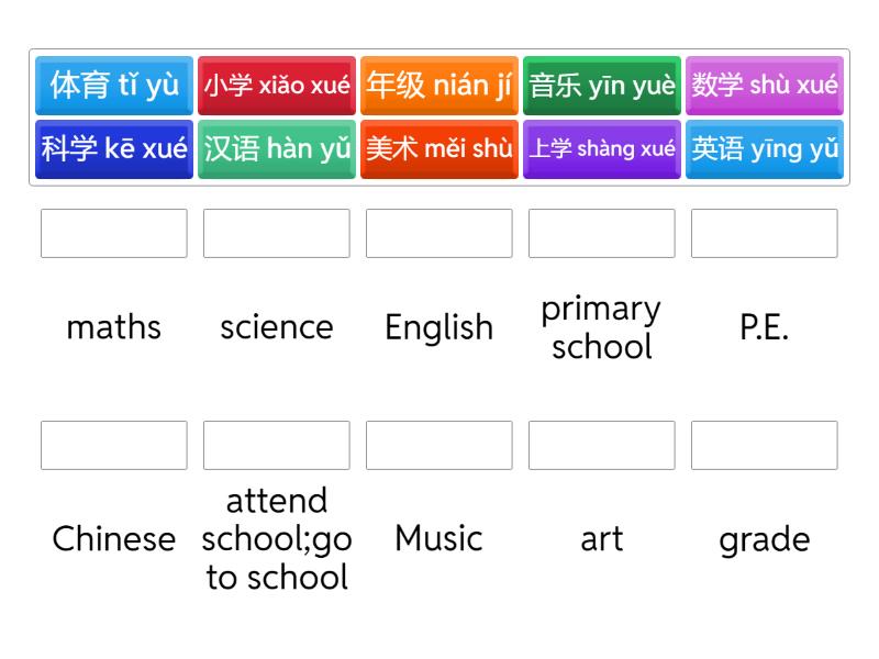 小学 xiǎo xué - primary school, 上学 shàng xué - attend school;go to school, 年级 nián jí - grade, 英语 yīng yǔ - English, 汉语 hàn yǔ - Chinese, 数学 shù xué - maths, 科学 kē xué - science, 美术 měi shù - art, 体育 tǐ yù - P.E., 音乐 yīn yuè - Music,