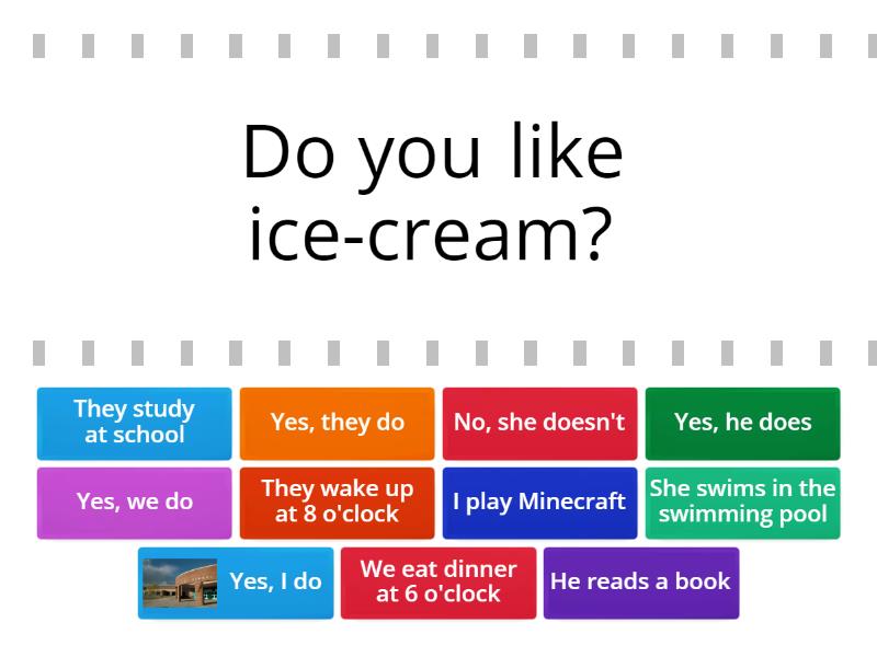 Yes, I do - Do you like ice-cream?, No, she doesn't - Does she play the guitar?, Yes, they do - Do they watch tv?, Yes, he does - Does he take a shower?, Yes, we do - Do we have a dog?, I play Minecraft - What computer game do you play?, She swims in the swimming pool - Where does she swim?, They wake up at 8 o'clock - When do they wake up?, He reads a book - What does he read?, They study at school - Where do they study?, We eat dinner at 6 o'clock - When do we eat dinner?,