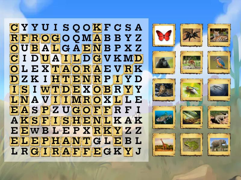 bird, butterfly, crocodile, elephant, fish, fly, frog, giraffe, kangaroo, lion, monkey, snake, spider, tiger, whale,