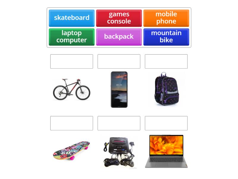 backpack, games console, laptop computer, mobile phone, mountain bike, skateboard,
