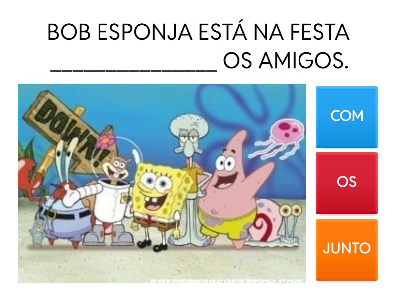1) BOB ESPONJA ESTÁ NA FESTA _______________ OS AMIGOS. a) COM b) OS c) JUNTO 2) BOB ESPONJA COME _____ LANCHE. a) OS b) O c) UM 3) ONTEM FOMOS AO PARQUE ____ AO CINEMA. a) E b) UM c) COM 4) O MENINO CAIU _______ ESTAVA CORRENDO a) E b) PORQUE 5) O MENINO QUERIA ____ ELA FOSSE JUNTO. a) E b) QUE 6) GABRIEL ____ PROFESSORA ADRIENE ESTUDAM. a) A b) E 7) GABRIEL PARTICIPA DAS AULAS ____ SEUS COLEGAS. a) OS b) COM c) E 8) EU LIGO ____ CÂMERA PARA VER A PROFESSORA. a) UMA b) A c) E 9) EU BRINCO _____ MEUS BRINQUEDOS. a) COM b) OS c) E 10) EU ESTUDO ___ IMA. a) COM b) NO c) EM 11) EU GOSTO ___ ASSISTIR BOB ESPONJA. a) E b) DE c) COM