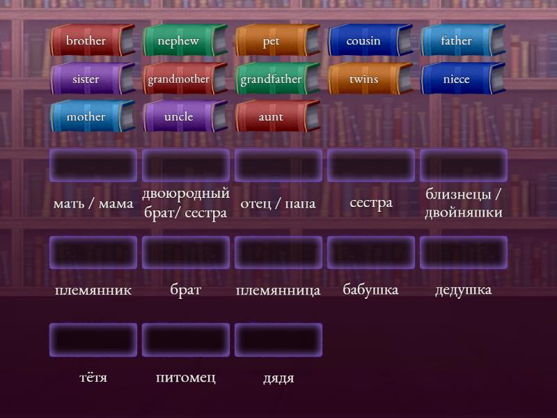 brother - брат, aunt - тётя, grandmother - бабушка, pet - питомец, father - отец / папа, cousin - двоюродный брат/ сестра, grandfather - дедушка, sister - сестра, uncle - дядя, mother - мать / мама, twins - близнецы / двойняшки, niece - племянница, nephew - племянник,