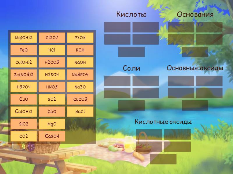 Кислоты: H2SO4, HNO3, HCl, H3PO4, H2CO3, Основания: Сa(OH)2, Cu(OH)2, KOH, NaOH, Mg(OH)2, Соли: СaSO4, CuCO3, NaCl, Na3PO4, Zn(NO3)2, Основные оксиды: СuO, Na2O, CaO, MgO, FeO, Кислотные оксиды: SO2, P2O5, CO2, SiO2, Cl2O7,