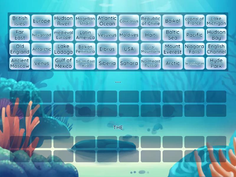 ---: Siberia, Lake Michigan, Northeast Russia, Novgorod, medieval Europe, Europe, Washington, Mount Everest, South-East Asia, Ancient Moscow, Hudson Bay, Lake Ladoga, Haiti, Elbrus, Niagara Falls, Hyde Park, Vesuvius, Latin America, Venus, Old England, THE: Hudson River, Ural Mountains, capital of France, Caucasus, Atlantic Ocean, Baltic Sea, British Isles, USA, Maldives, Pacific, Magellan strait, Gulf of Mexico , Baikal, English Channel, Balkan Peninsula, Far East, Arctic, Antarctic, Republic of Chine, Sahara,
