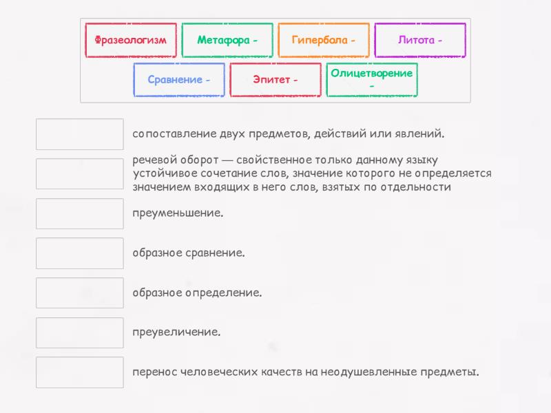 Метафора - - образное сравнение., Эпитет - - образное определение., Олицетворение - - перенос человеческих качеств на неодушевленные предметы., Гипербола - - преувеличение., Литота - - преуменьшение., Сравнение - - сопоставление двух предметов, действий или явлений., Фразеологизм - речевой оборот — свойственное только данному языку устойчивое сочетание слов, значение которого не определяется значением входящих в него слов, взятых по отдельности,