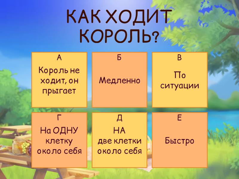 1) На КАКОЙ картинке изображен Король? a) b) c) d) e) f) 2) Найди Короля на ДИАГРАММЕ? a) b) c) d) e) f) 3) Какое "ПРИЛАГАТЕЛЬНОЕ" подходит к Королю больше всего? a) ДАЛЬНОБОЙНЫЙ b) ГЛАВНЫЙ c) СИЛЬНЫЙ d) НИЗКИЙ e) КОРИЧНЕВЫЙ f) ЯРКИЙ 4) Выбери ПРАВИЛЬНОЕ утверждение. a) КОРОЛЬ ИНОГДА НА ДОСКЕ b) КОРОЛЯ МОЖНО СЪЕСТЬ c) КОРОЛЬ ВСЕГДА НА ДОСКЕ d) КОРОЛЬ САМАЯ НИЗКАЯ ФИГУРА e) КОРОЛЬ ВСЕГДА В ЦЕНТРЕ 5) КАК ХОДИТ КОРОЛЬ? a) НА две клетки около себя b) Король не ходит, он прыгает c) Медленно d) Быстро e) На ОДНУ клетку около себя f) По ситуации 6) КАК АТАКУЕТ КОРОЛЬ? a) Король никогда не атакует b) Атаковать-не Королевское дело c) На одну клетку около себя d) По настроению в КОНЦЕ партии e) БЫСТРО в ЮЖНОМ направлении 7) Сколько ВОЗМОЖНЫХ ходов у Короля в УГЛУ доски? a) ТРИ b) ДВА c) ПЯТЬ d) ВОСЕМЬ e) ОДИН f) ЧЕТЫРЕ 8) МОГУТ ЛИ КОРОЛИ ОКАЗАТЬСЯ НА СОСЕДНИХ КЛЕТКАХ? a) ДА b) ИНОГДА c) НЕТ d) ТОЛЬКО У ГРОССМЕЙСТЕРОВ e) ТОЛЬКО УСТАВШИЕ f) ВСЕГДА РЯДОМ СТОЯТ 9) МОЖЕТ ЛИ КОРОЛЬ СЪЕСТЬ ДРУГОГО КОРОЛЯ? a) ДА b) ТОЛЬКО ЕСЛИ ДРУГОЙ РЯДОМ c) БЫВАЕТ d) НЕТ e) ЧАСТО ТАК ДЕЛАЮ f) ДА, ПО ПРАВИЛАМ 10) СКОЛЬКО ВОЗМОЖНЫХ ХОДОВ У ЧЁРНОГО КОРОЛЯ? a) 1 b) 5 c) МНОГО d) ВСЕГО 2 e) 3 f) 8 11) МОЖНО ЛИ СХОДИТЬ ПО ЖЁЛТОЙ СТРЕЛКЕ? a) ДА b) ЧАСТО c) ЗАПРЕЩЕНО d) ТОЛЬКО В ИНТЕРНЕТЕ e) ЭТО ПО ПРАВИЛАМ f) ТОЛЬКО 1 РАЗ В ПАРТИИ 12) ЧТО ТАКОЕ "БИТОЕ ПОЛЕ"? a) АТАКА ПОЛЯ СОПЕРНИКОМ b) ЗАЩИТА ВАШИМИ ФИГУРАМИ c) ЗАТРУДНЯЮСЬ С ОТВЕТОМ d) ПРОБЛЕМНЫЕ МЕСТА НА ДОСКЕ e) ВСЕ БЕЛЫЕ КЛЕТКИ f) ВСЕ ЦЕНТРАЛЬНЫЕ ПОЛЯ