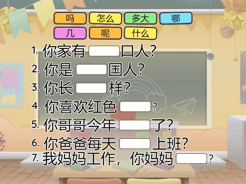 1. 你家有____口人? 2. 你是____国人? 3. 你长____样? 4. 你喜欢红色____? 5. 你哥哥今年____了? 6. 你爸爸每天____上班? 7. 我妈妈工作,你妈妈____?