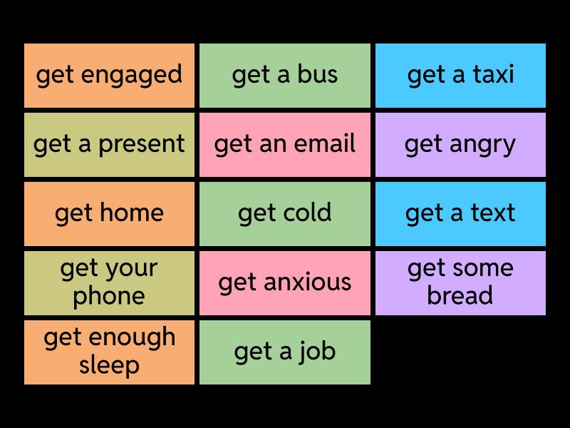 get an email - receive, get a job - obtain, get a bus - catch, get home - arrive (at), get your phone - buy, get anxious - become, get some bread - buy, get enough sleep - obtain, get a present - receive, get engaged - become, get angry - become, get a taxi - catch, get cold - become, get a text - receive,