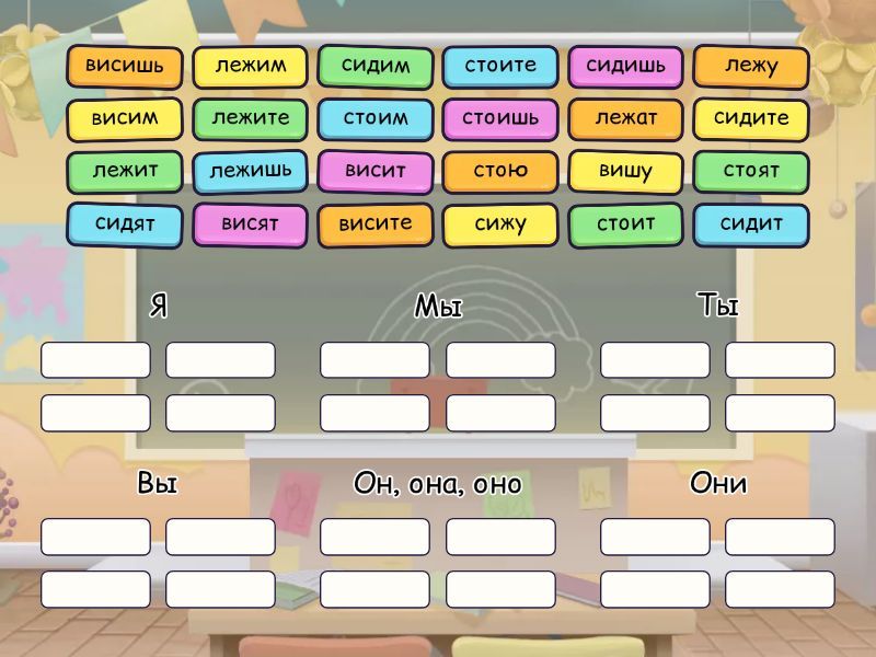 Я : лежу, вишу, стою, сижу, Мы: сидим, стоим, лежим, висим, Ты: сидишь, висишь, стоишь, лежишь, Вы: сидите, стоите, лежите, висите, Он, она, оно: сидит, висит, лежит, стоит, Они: лежат, стоят, висят, сидят,