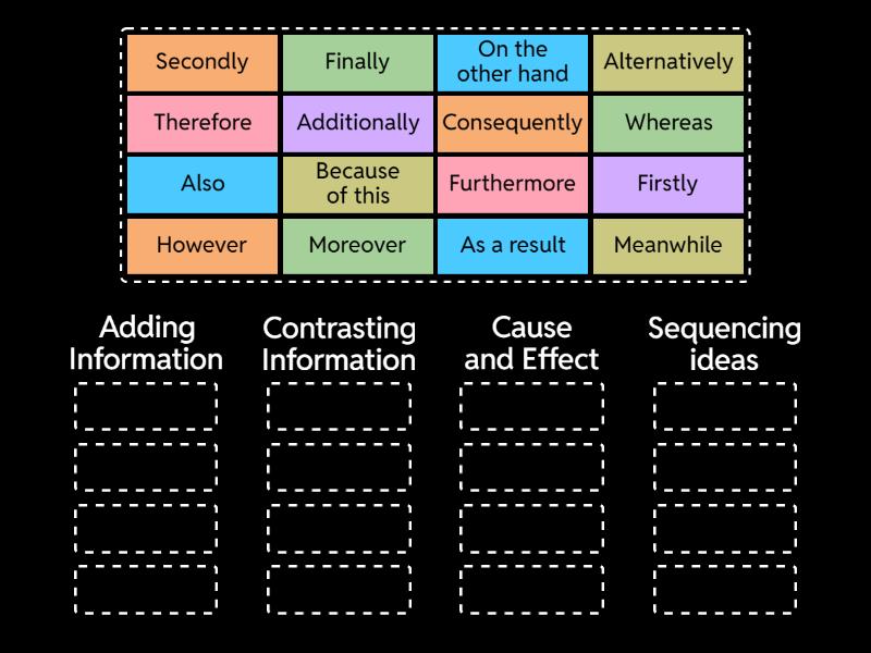 Adding Information: Also, Additionally, Moreover, Furthermore, Contrasting Information: However, On the other hand, Whereas, Alternatively, Cause and Effect: Therefore, Consequently, As a result, Because of this, Sequencing ideas: Firstly, Meanwhile, Finally, Secondly,