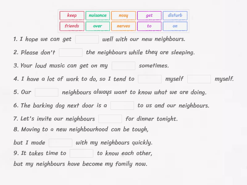1. I hope we can get ____ well with our new neighbours. 2. Please don't ____ the neighbours while they are sleeping. 3. Your loud music can get on my ____ sometimes. 4. I have a lot of work to do, so I tend to ____ myself ____ myself. 5. Our ____ neighbours always want to know what we are doing. 6. The barking dog next door is a ____ to us and our neighbours. 7. Let's invite our neighbours ____ for dinner tonight. 8. Moving to a new neighbourhood can be tough, but I made ____ with my neighbours quickly. 9. It takes time to ____ to know each other, but my neighbours have become my family now.