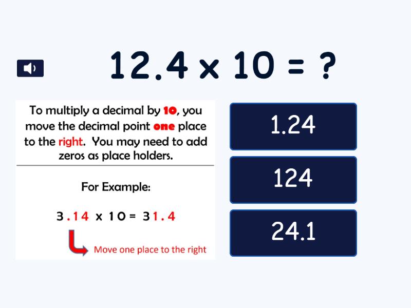 1) 12.4 x 10 = ? a) 124 b) 1.24 c) 24.1 2) 32.1 x 100 = ? a) 3 210 b) 321 c) 312 3) 12.46 ÷ 10 = ? a) 124.6 b) 0.1246 c) 1.246 4) 13.212 ÷ 100 = ? a) 0.13212 b) 1.3212 c) 132.12 5) Divide 23.7 by 100 a) 2.37 b) 0.237 c) 237 6) Divide 0.4 by 100 a) 4 b) 0.004 c) 0.0004 7) Multiply 78.21 by 10 a) 7.821 b) 782.1 c) 7821.0 8) Multiply 468.25 by 100 a) 4682.5 b) 46 825 c) 46.825 9) Round this decimal to the nearest TEN a) 540 b) 550 c) 546.3 10) Round this decimal to the nearest TENTH a) 65.3 b) 70.38 c) 65.4 11) Round this decimal to the nearest HUNDREDTH a) 56.79 b) 56.78 c) 5.678 12) 8.12 x 10 = ? a) 08.12 b) 81.2 c) 812.1 13) 1.593 ÷ 10 = ? a) 15.93 b) 0.1593 c) 0.01593 14) You have aced decimals a) Yes b) No, I need more practice c) Absolutely