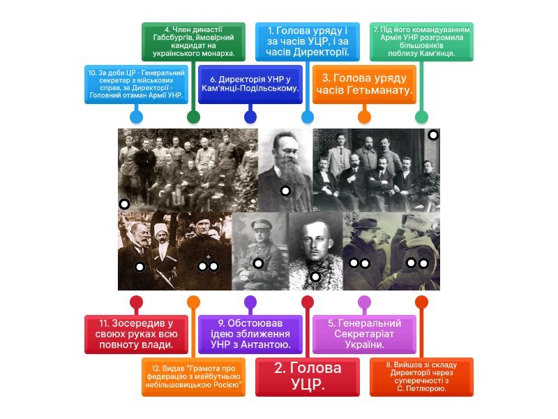 1. Голова уряду і за часів УЦР, і за часів Директорії., 2. Голова УЦР., 3. Голова уряду часів Гетьманату., 4. Член династії Габсбургів, ймовірний кандидат на українського монарха., 5. Генеральний Секретаріат України., 6. Директорія УНР у Кам'янці-Подільському., 7. Під його командуванням Армія УНР розгромила більшовиків поблизу Кам'янця., 8. Вийшов зі складу Директорії через суперечності з С. Петлюрою., 9. Обстоював ідею зближення УНР з Антантою., 10. За доби ЦР - Генеральний секретар з військових справ, за Директорії - Головний отаман Армії УНР., 11. Зосередив у своюх руках всю повноту влади., 12. Видав "Грамота про федерацію з майбутньою небільшовицькою Росією".