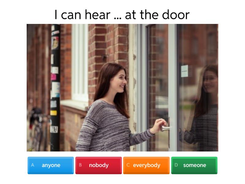 1) I can hear ... at the door a) anyone b) nobody c) everybody d) someone 2) ....... is coming to my birthday party today. It is very sad. a) Everyone b) No one c) Someone d) Anyone 3) I want to be alone. I don´t want to see ......... a) no one b) someone c) anyone d) everyone 4) I'm sad because ... remembers about my birthday. a) everyone b) someone c) no one d) anyone 5) I couldn't find ........ at the park a) no one b) everyone c) anyone d) someone 6) Look at my hands. I have ......... !! a) something b) nothing c) anything 7) Let's go ........ with me. You'll like it. a) somewhere b) anywhere c) nowhere 8) All places are dangerous. ........ is safe. a) nowhere b) somewhere c) anywhere d) everywhere 9) Is there ... that can lend me some money? a) anyone b) everyone c) no one 10) Would ....... like to watch a movie with me? a) everywhere b) anyone c) no one d) everyone 11) Everyone ... it. a) does b) do 12) ... anyone here? a) Is b) Are 13) Everyone ... pancakes. a) love b) loves 14) Nowhere .. safe. a) is b) are 15) Nothing ... better for finding information that Google. a) is b) are