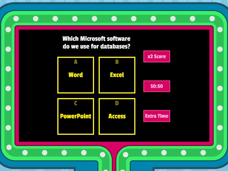 1) Which Microsoft software do we use for databases? a) Word b) Excel c) PowerPoint d) Access 2) The view we use to see and edit the field names and field types a) Databases view b) Design view c) Datasheet view d) Desktop view 3) When typing field names, we use: a) Sentence case b) Lower case letters c) Capital letters d) Capitalise each word 4) An object in Access that consist of columns and rows, and that holds data a) Field name b) Table c) Field type d) Primary key 5) The view we use to see and edit records a) Databases view b) Design view c) Datasheet view d) Desktop view 6) What indicates the data that goes in each column (e.g. first name) a) Field name b) Field type c) Primary key d) Table 7) What indicates the type of data that should be entered (e.g. Number) a) Field name b) Field type c) Primary key d) Table 8) How we print a database a) File and print on Access b) Export to Access and print c) Export to Word and print d) Export to Excel and print 9) The last steps to do, just before you print? a) Change orientation to landscape and add a footer b) Change orientation to landscape and add a header c) Change orientation to portrait and add a footer d) Change orientation to portrait and add a header