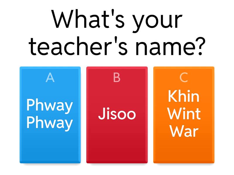 1) What's your teacher's name? a) Phway Phway b) Jisoo c) Khin Wint War 2) Tr Phway is from _______. a) Yangon b) Mandalay c) Pyay 3) I have two _________. a) Sisters b) Brothers 4) I have a _______. a) Cat b) Dog 5) Which days do you attend the class? a) Saturday, Sunday b) Monday, Tuesday, Wednesday, Thursday 6) How many minutes do you need to join to get the attendance? a) 60 minutes b) 90 minutes c) 30 minutes 7) In the class, which language do you speak? a) only English b) both English and Burmese 8) How many units do you have to learn at level 3? a) 4 b) 6 c) 5 9) How many writing assignments do you need to submit? a) 6 b) 4 c) 5 10) To complete this level, you need to take _______. a) 2 (mid-term and final) b) 1 (only final)
