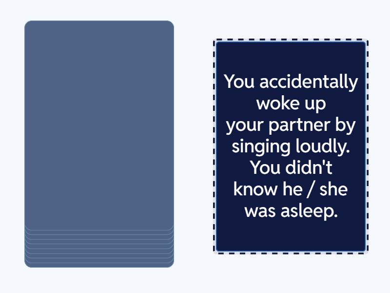 You accidentally woke up your partner by singing loudly. You didn't know he / she was asleep., You borrowed your partner’s book. You accidentally ripped (= to tear) one of the pages., Your guest is not going to leave, though it’s already midnight and you’ve got to go to work tomorrow., Your guests want to gift you some flowers, though you’ve got an allergy to them., You are invited to your friend's house. You want to take your friend with you., Your friend wants to use your phone to make a call., You've made a cake. Your friend wants to try the cake., Your mum has come to your place. But your house is in a mess., You are in the office and your colleague has come to discuss the report., Your wife/ husband has come from work and is tired..