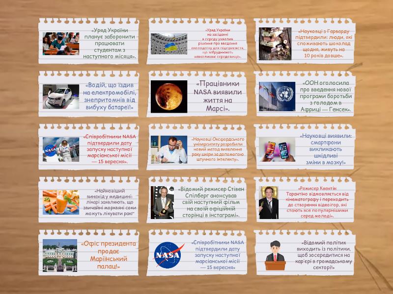 «Найновіший винахід у медицині: лікарі заявляють, що звичайні морквяні соки можуть лікувати рак!" - неправда, «Відомий політик виходить із політики, щоб зосередитися на кар’єрі в громадському секторі!» - неправда, «Науковці Оксфордського університету розробили новий метод виявлення раку шкіри за допомогою штучного інтелекту». - правда, «Відомий режисер Стівен Спілберг анонсував свій наступний фільм на своїй офіційній сторінці в інстаграмі». - правда, «Співробітники NASA підтвердили дату запуску наступної марсіанської місії — 15 вересня». - правда, «Науковці з Гарварду підтвердили: люди, які споживають шоколад щодня, живуть на 10 років довше». - маніпуляція, «Працівники NASA виявили життя на Марсі». - маніпуляція в заголовку, «ООН оголосила про введення нової програми боротьби з голодом в Африці — Генсек». - правда, «Офіс президента продає Маріїнський палац!» - неправда, «Водій, що їздив на електромобілі, знепритомнів від вибуху батареї!» - неправда, «Науковці виявили: смартфони викликають шкідливі зміни в мозку!» - неправда, «Уряд України на засіданні в середу ухвалив рішення про введення екоподатку для підприємств, що забруднюють навколишнє середовище». - правда, «Уряд України планує заборонити працювати студентам з наступного місяця». - маніпуляція в заголовку , «Режисер Квентін Тарантіно відмовляється від кінематографу і переходить до створення відеоігор, які стають все популярнішими серед молоді». - маніпуляція, «Співробітники NASA підтвердили дату запуску наступної марсіанської місії — 15 вересня» - правда,