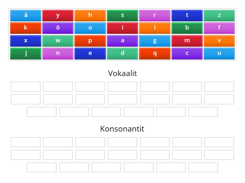 Vokaalit: a, e, i, o, u, y, ä, ö, Konsonantit: b, c, d, f, g, h, j, k, l, m, n, p, q, r, s, t, v, w, x, z,