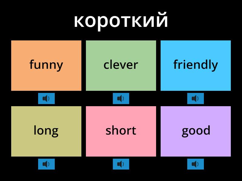 1) короткий a) funny b) clever c) friendly d) long e) short f) good 2) длинный a) angry b) long c) tall d) bad e) naughty f) nice 3) злой a) best b) short c) clever d) tall e) funny f) angry 4) дружелюбный a) friendly b) tall c) good d) nice e) best f) long 5) высокий a) angry b) bad c) clever d) short e) tall f) naughty 6) умный a) good b) angry c) clever d) long e) nice f) bad 7) забавный a) long b) bad c) funny d) good e) naughty f) best 8) хороший a) short b) good c) tall d) angry e) friendly f) nice 9) плохой a) funny b) nice c) friendly d) angry e) long f) bad 10) непослушный a) short b) naughty c) clever d) best e) good f) tall 11) милый a) long b) angry c) nice d) bad e) funny f) friendly 12) лучший a) best b) short c) naughty d) clever e) angry f) tall 13) ленивый a)  naughty b) bad c) clever d) lazy e) tall f) short 14) маленький a) long b) little c) friendly d) good e) nice f) funny