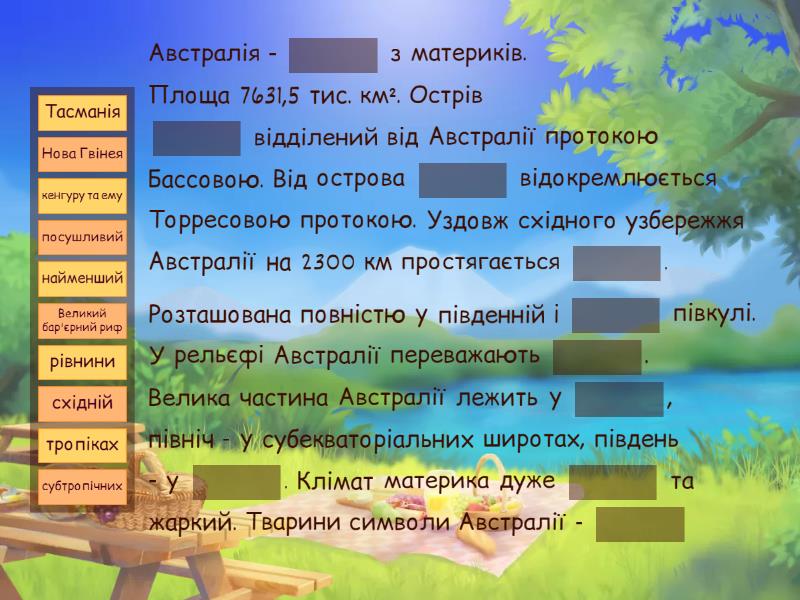 Австралія - ____ з материків. Площа 7631,5 тис. км². Острів ____ відділений від Австралії протокою Бассовою. Від острова ____ відокремлюється Торресовою протокою. Уздовж східного узбережжя Австралії на 2300 км простягається ____. Розташована повністю у південній і ____ півкулі. У рельєфі Австралії переважають ____. Велика частина Австралії лежить у ____, північ - у субекваторіальних широтах, південь - у ____. Клімат материка дуже ____ та жаркий. Тварини символи Австралії - ____ Найбагатоводніша ріка Австралії - ____ з головною притокою ____ - найдовша ріка Австралії (довжина 2740 км). Найбільше озеро Австралії - ____. Особливість Австралії - її багатство на ____ води, що накопичуються на глибинах 1,5-2 км. ____ у Центральній низовині - найбільший у світі. 60% території материка займають області внутрішнього стоку з рідкими тимчасовими водотоками - ____.