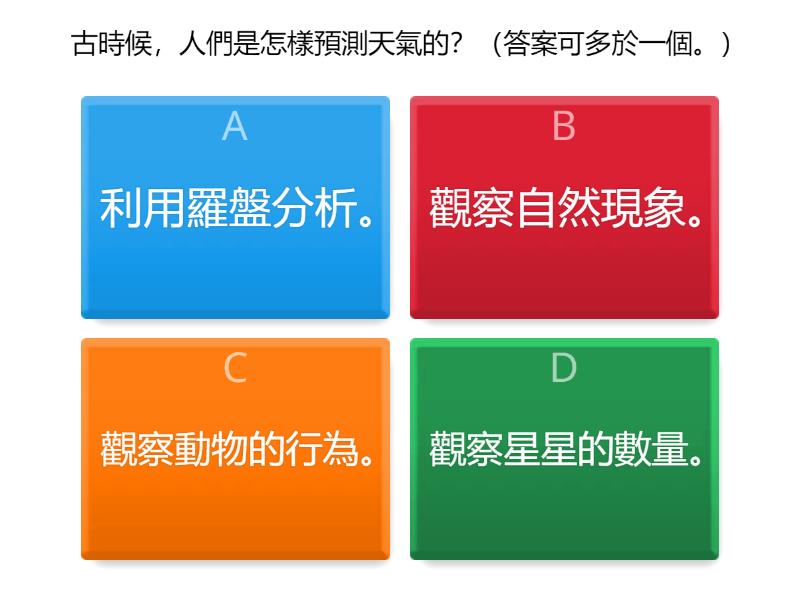 1) 以下哪些人物有留意天氣情況? a) 下雨天,小偉到操場踢球。 b) 天氣炎熱,樂兒帶備傘子出門。 c) 颱風將至,美美去逛街。 d) 氣温下降,小強穿着單薄的衣服。 2) 以下哪項不是獲取天氣資料的媒介? a) 課本。 b) 網頁。 c) 電視。 d) 報紙。 3) 以下哪項不是市民可以即時取得天氣資料的途徑? a) 新聞報道。 b) 互聯網。 c) 報紙。 d) 電台。 4) 我們可從以下哪些媒介取得最新的天氣消息?(答案可多於一個。) a) 電話。 b) 收音機。 c) 互聯網。 d) 報紙。 5) 以下哪個機構負責觀測和預報香港的天氣? a) 香港消防處。 b) 香港紅十字會。 c) 香港天文台。 d) 香港太空館。 6) 以下哪些是香港天文台的主要工作?(答案可多於一個。) a) 在惡劣天氣下維持社會秩序。 b) 收集氣象資料。 c) 向不同媒體發佈天氣資料。 d) 決定學校在惡劣的天氣下停課。 7) 以下哪些對香港天文台預測天氣的描述是正確的?(答案可多於一個。) a) 香港天文台使用先進的儀器及技術去預測天氣。 b) 香港天文台收集各地的天氣數據作出分析並預測天氣。 c) 香港天文台的工作人員通過觀察動物來預測天氣。 d) 香港天文台的工作人員只需觀察雲層便可預測天氣。 8) 古時候,人們是怎樣預測天氣的?(答案可多於一個。) a) 觀察自然現象。 b) 觀察動物的行為。 c) 利用羅盤分析。 d) 觀察星星的數量。 9) 以下哪項儀器可以用來觀測風向? a) 指南針。 b) 雨量計。 c) 風向儀。 d) 温度計。 10) 以下哪項不是惡劣天氣可能會帶來的影響? a) 低窪地區出現水浸。 b) 山泥傾瀉。 c) 樹木倒塌。 d) 天空出現彩虹。 11) 在惡劣天氣下,人們進行以下哪項活動會有危險? a) 暴雨時遠足。 b) 打雷時站在樹下。 c) 打雷時游泳。 d) 以上三項皆正確。 12) 暴雨警告信號共分為多少級? a) 2 級。 b) 3 級。 c) 4 級。 d) 5 級。 13) 以下哪種顏色的暴雨警告信號表示市民應該到安全的地方暫避? a) 黑色。 b) 黃色。 c) 紅色。 d) 白色。 14) 當以下哪些警告信號發出時,小學需要停課?(答案可多於一個。) a) 雷暴警告信號。 b) 黑色暴雨警告信號。 c) 8 號熱帶氣旋警告信號。 d) 黃色暴雨警告信號。 15) 以下哪種熱帶氣旋警告信號發出時,學校不用停課? a) 10 號。 b) 9 號。 c) 8 號。 d) 1 號。 16) 因天氣惡劣停課時,進行以下哪些活動是正確的? a) 在家中看書。 b) 到公園遊玩。 c) 到海邊游泳。 d) 在單車徑騎單車。 17) 當香港天文台發出 8 號熱帶氣旋警告信號時,進行以下哪項活動是安全的? a) 逛街。 b) 到海邊游泳。 c) 到公園遊玩。 d) 在室內下棋。 18) 香港天文台預報短時間內會發出8號或以上熱帶氣旋警告信號時,以下哪種行為是錯誤的? a) 留在室內安全的地方。 b) 到海邊觀浪。 c) 做好防風措施。 d) 把植物由室外搬回室內。 19) 以下哪項關於天氣情況的描述是正確的? a) 當黃色暴雨警告信號生效時,小學需要停課。 b) 當打雷時,我們要站在樹下,以免被雷電擊中。 c) 當酷熱天氣警告信號生效時,我們要多喝開水。 d) 香港的熱帶氣旋警告信號分為 6 個級別。 20) 每年大約三至四月,是香港哪個季節? a) 春季。 b) 夏季。 c) 秋季。 d) 冬季。 21) 香港哪個季節是既涼快又乾爽的? a) 春季。 b) 夏季。 c) 秋季。 d) 冬季。 22) 一般情況下,香港哪個季節的時間較長?(答案可多於一個。) a) 春季。 b) 夏季。 c) 秋季。 d) 冬季。 23) 一般情況下,香港哪個季節的降雨量最多? a) 春季。 b) 夏季。 c) 秋季。 d) 冬季。 24) 學校是在甚麼季節放暑假的? a) 春季。 b) 夏季。 c) 秋季。 d) 冬季。 25) ??以下哪項是有關香港夏季景色的描述? a) 植物葉片疏落或變成禿枝。 b) 植物有些枯黃或落葉。 c) 花草樹木生長茂盛。 d) 花草樹木長出嫩葉和新芽。 26) 在香港,我們多在春季進行以下哪種活動? a) 觀賞剛長出嫩葉和新芽的花草樹木。 b) 到沙灘游泳。 c) 賞月。 d) 吃火鍋。 27) 在夏季,我們外出前適宜帶備以下哪種物品,以適應這個季節的天氣? a) 手套。 b) 頸巾。 c) 傘子。 d) 眼鏡。 28) 以下哪項科技產品可以幫助我們適應潮濕的天氣? a) 電飯煲。 b) 抽濕機。 c) C.洗衣機。 d) 微波爐。 29) 以下哪項科技產品可以幫助我們適應夏季的天氣? a) 抽濕機。 b) 冷氣機。 c) 乾衣機。 d) 電暖爐。 30) 以下哪項科技產品可以幫助我們適應寒冷的天氣? a) 抽濕機。 b) 冷氣機。 c) 電暖爐。 d) 乾衣機。
