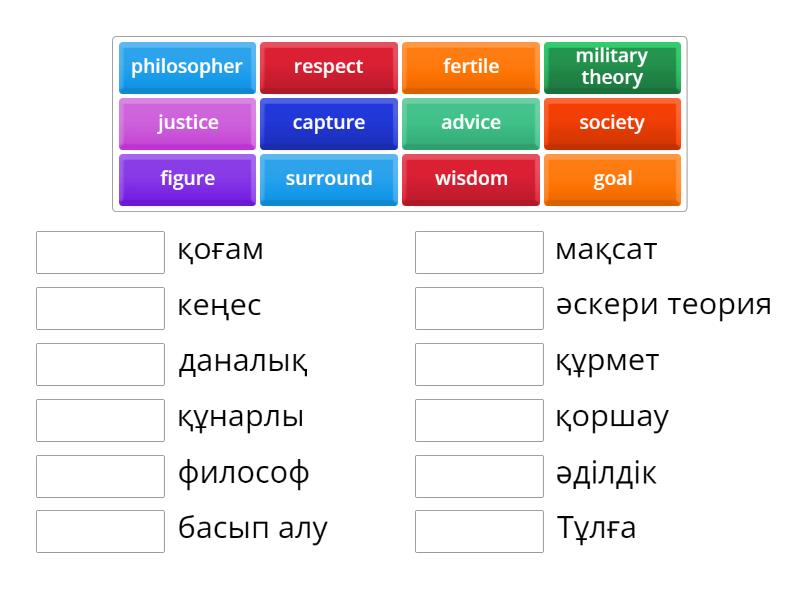 figure - Тұлға , philosopher - философ , surround - қоршау, capture - басып алу , respect - құрмет , goal - мақсат , military theory - әскери теория , advice - кеңес , justice - әділдік , wisdom - даналық , fertile - құнарлы , society - қоғам ,