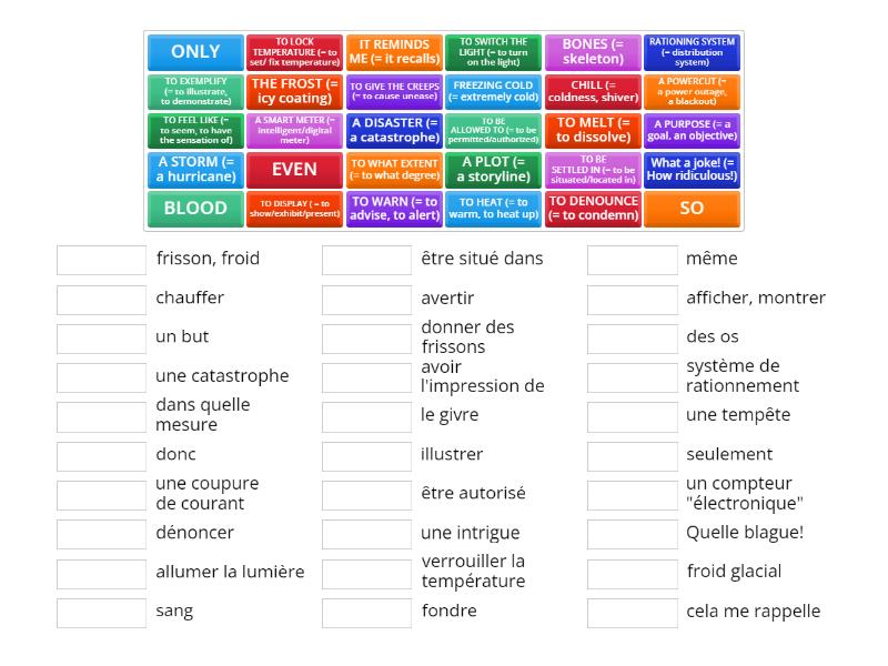 TO DISPLAY ( = to show/exhibit/present) - afficher, montrer, FREEZING COLD (= extremely cold) - froid glacial, TO BE ALLOWED TO (= to be permitted/authorized) - être autorisé, TO HEAT (= to warm, to heat up) - chauffer, A SMART METER (= intelligent/digital meter) - un compteur "électronique", TO LOCK TEMPERATURE (= to set/ fix temperature) - verrouiller la température, What a joke! (= How ridiculous!) - Quelle blague!, TO MELT (= to dissolve) - fondre, THE FROST (= icy coating) - le givre, RATIONING SYSTEM (= distribution system) - système de rationnement, A POWERCUT (= a power outage, a blackout) - une coupure de courant, TO FEEL LIKE (= to seem, to have the sensation of) - avoir l'impression de, CHILL (= coldness, shiver) - frisson, froid, BONES (= skeleton) - des os, IT REMINDS ME (= it recalls) - cela me rappelle, A STORM (= a hurricane) - une tempête, TO GIVE THE CREEPS (= to cause unease) - donner des frissons, TO SWITCH THE LIGHT (= to turn on the light) - allumer la lumière, BLOOD - sang, SO - donc, ONLY - seulement, EVEN - même, TO WHAT EXTENT (= to what degree) - dans quelle mesure, TO EXEMPLIFY (= to illustrate, to demonstrate) - illustrer, A DISASTER (= a catastrophe) - une catastrophe, A PLOT (= a storyline) - une intrigue, TO BE SETTLED IN (= to be situated/located in) - être situé dans, A PURPOSE (= a goal, an objective) - un but, TO WARN (= to advise, to alert) - avertir, TO DENOUNCE (= to condemn) - dénoncer,